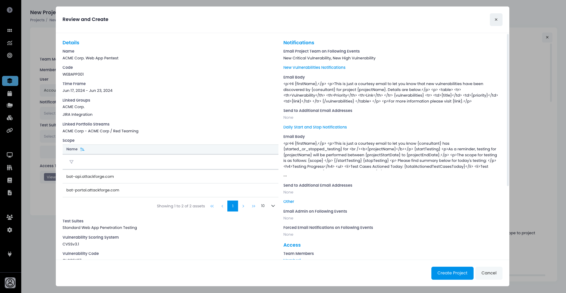 * **Reporting** - You can enable or disable [Reporting](https://support.attackforge.com/attackforge-enterprise/getting-started/reporting) on the project. This affects both reports which can be downloaded as well as the Executive Summary. You can also configure the lowest project access level required in order to see Reporting. You can also configure which application user roles can get access to Reporting on the project.