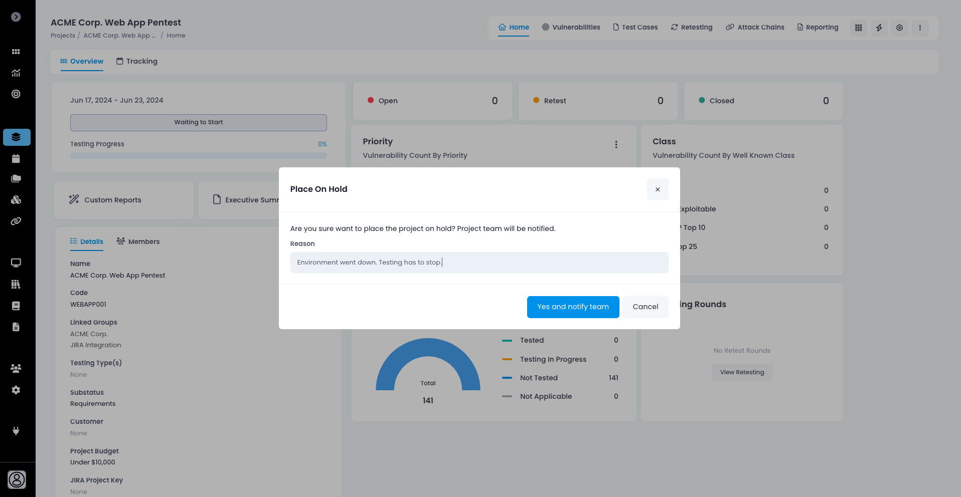When a project is placed on-hold or off-hold, an email will be sent to the project team with the reason why, and the project status will be updated.