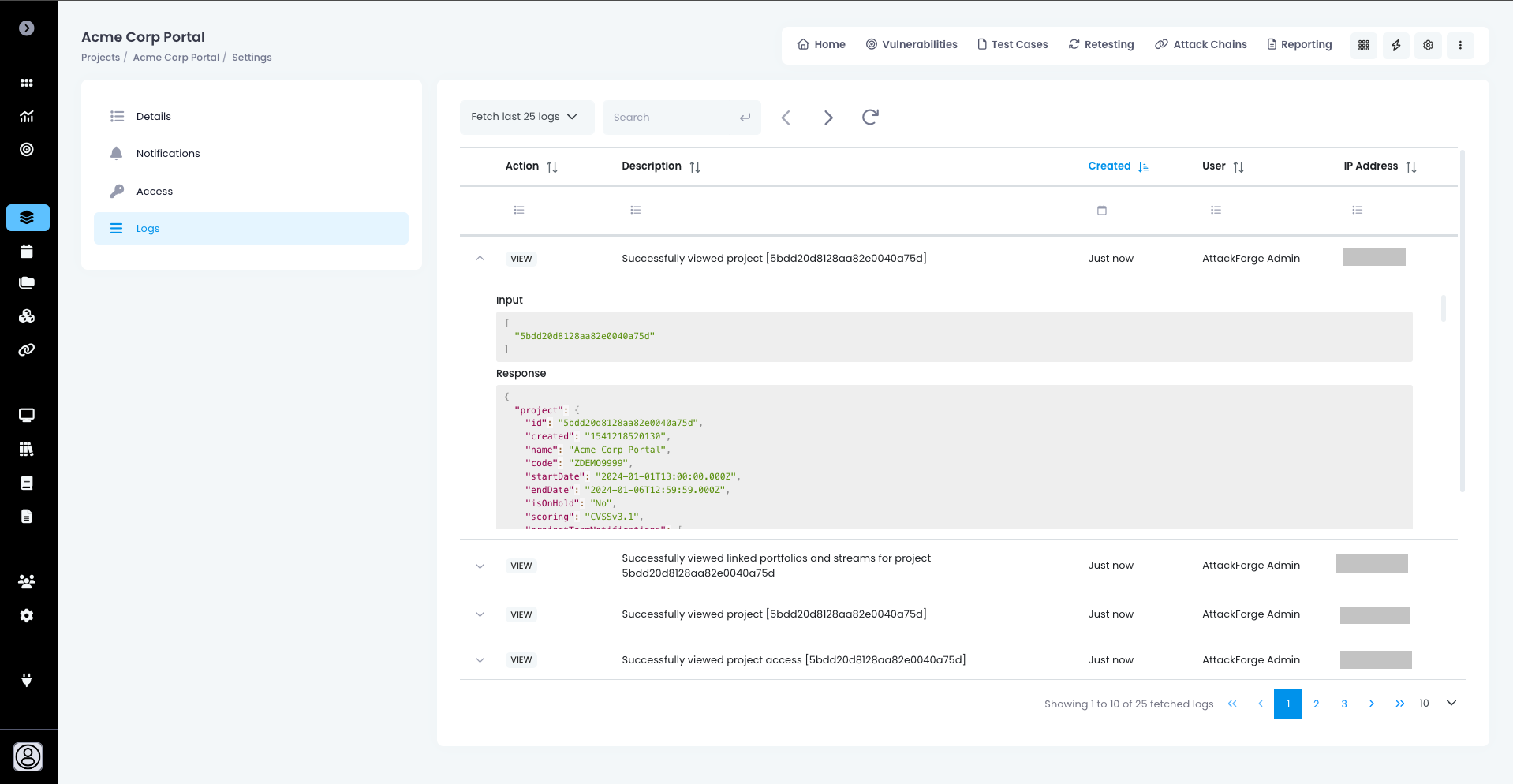 AttackForge is built upon Projects. Each project has scope (assets) and findings (vulnerabilities). Vulnerabilities are linked to assets.