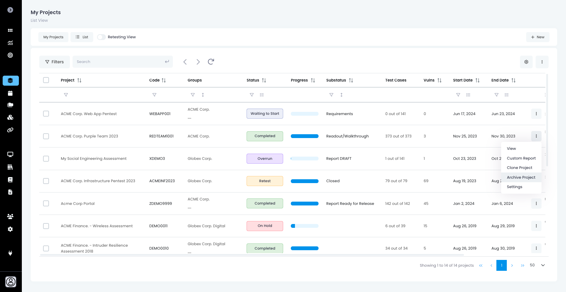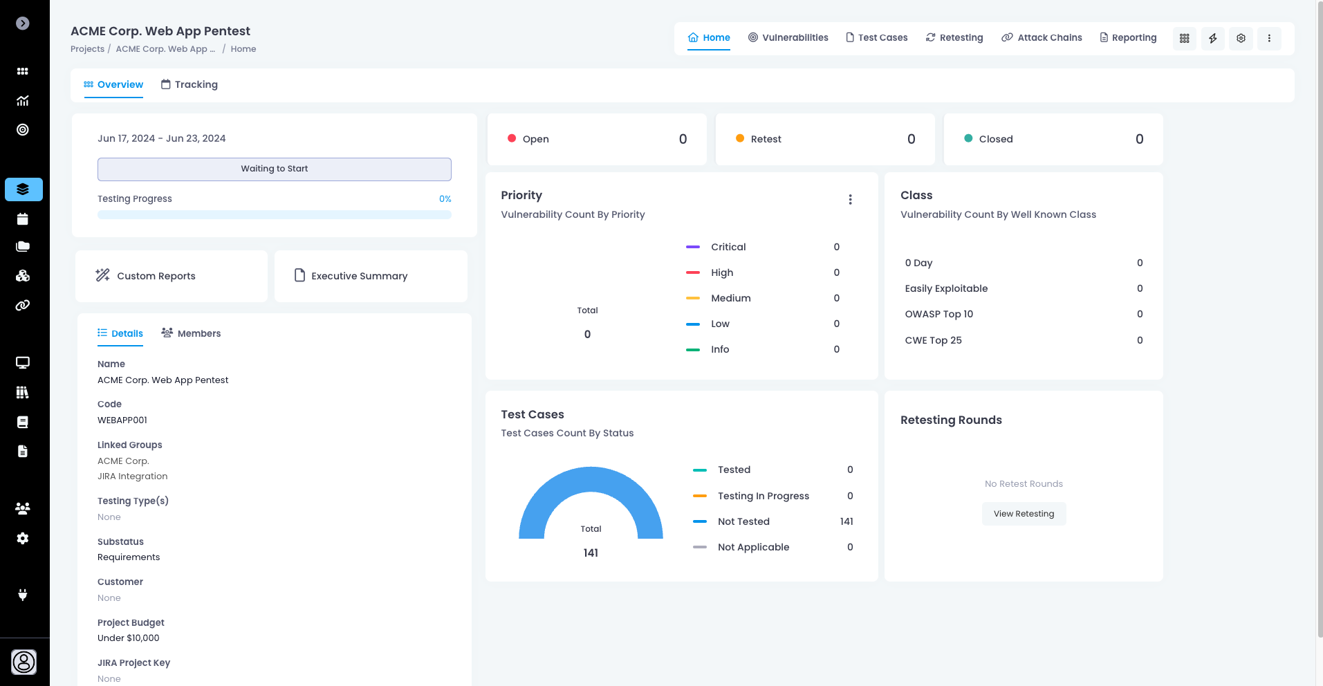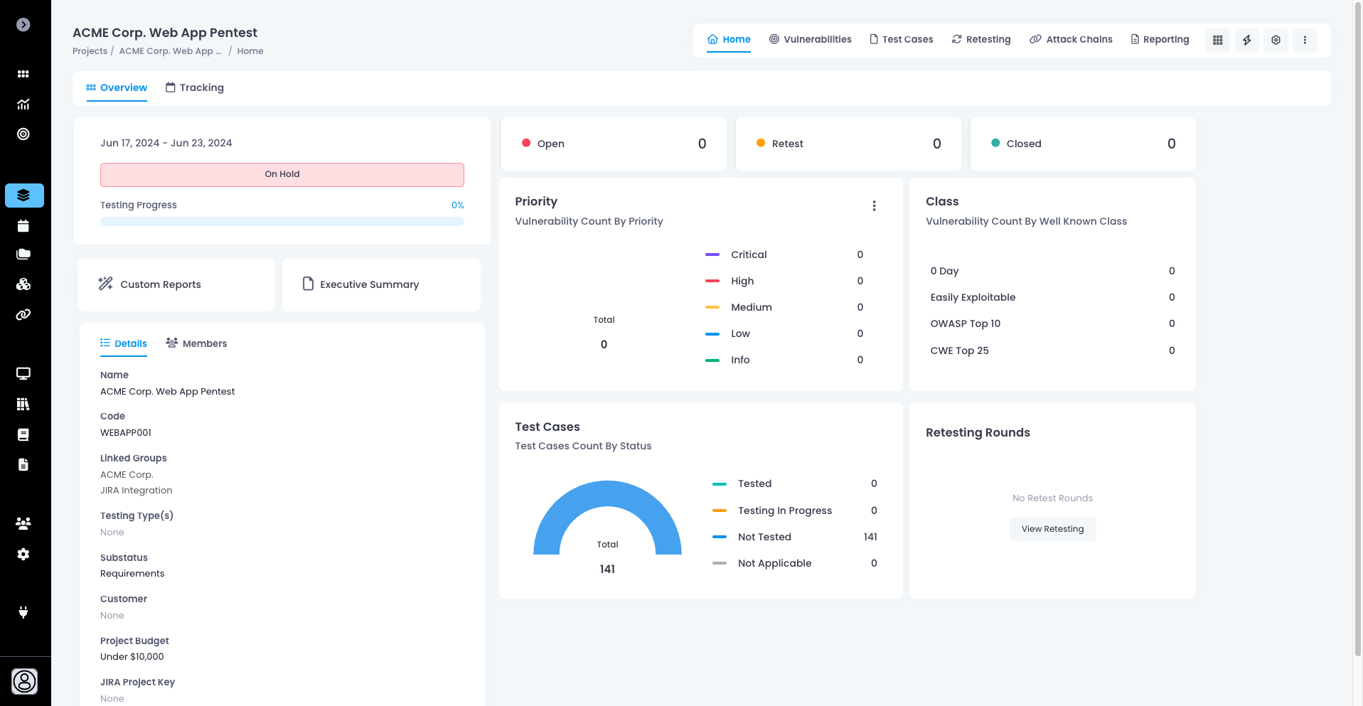 * **Retesting** - You can enable or disable [Retesting Rounds](https://support.attackforge.com/attackforge-enterprise/getting-started/retesting#request-a-retest) on the project. You can also configure the lowest project access level required in order to see Retesting Rounds. You can also configure which application user roles can get access to Retesting Rounds on the project.