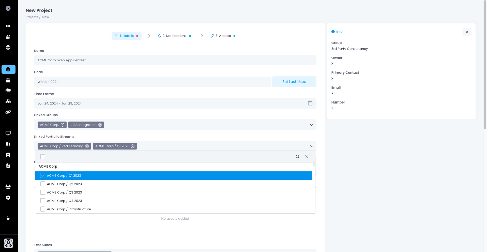 You can associate a project with one or more Portfolio Streams at time of project creation or approval; or when editing a project. Data from the project, such as vulnerabilities and assets, will be associated with the relevant portfolios and streams automatically.