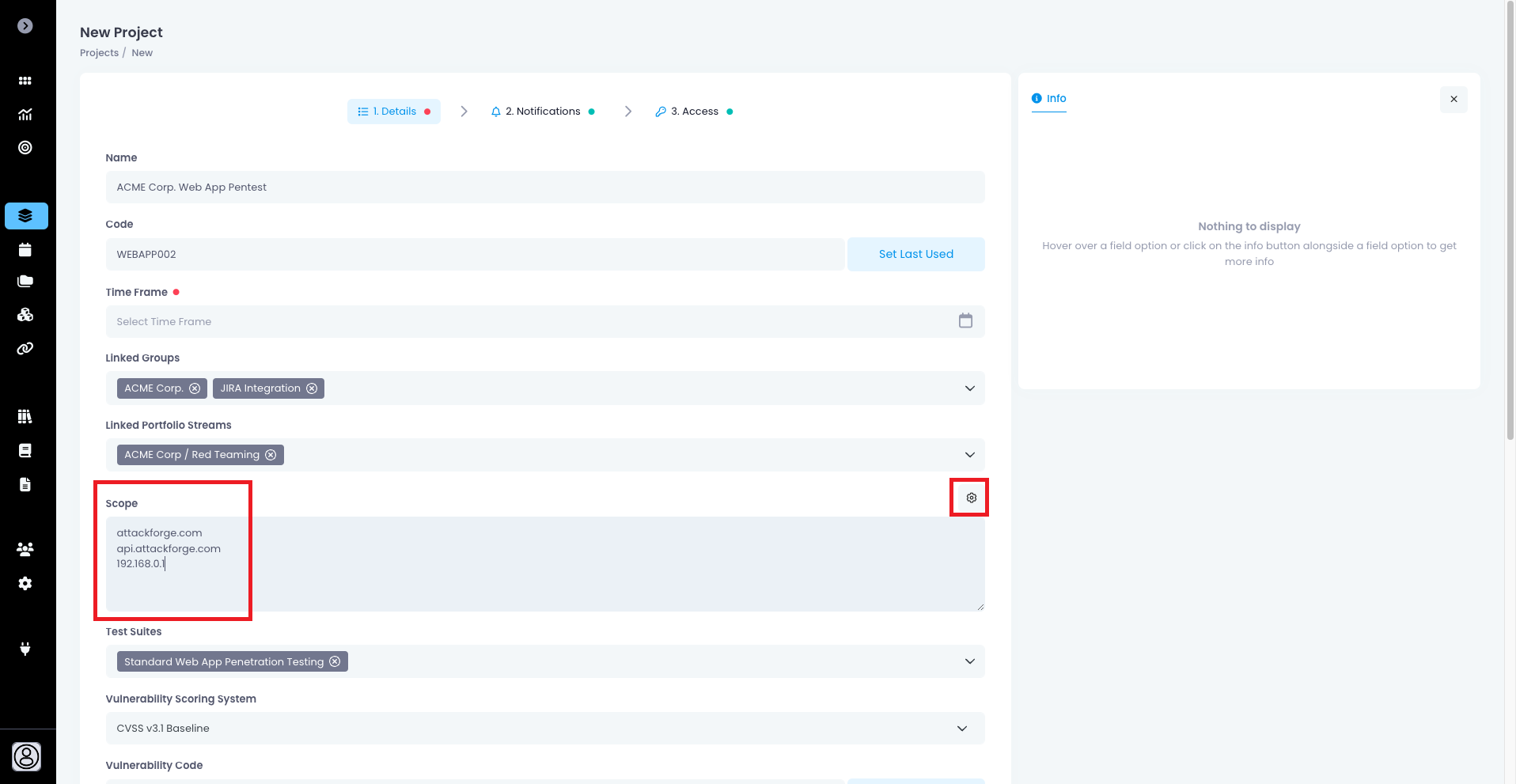 * Full details for each access level are displayed in the info panel, and can also be found in the [Access Control Matrix](https://support.attackforge.com/attackforge-enterprise/access-control-matrix)